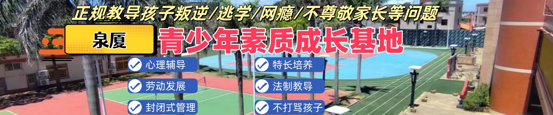 四维成长基地位于福建省泉州,目前在成长基地有学员近百人,已成功帮助数百位学员达到预期回归校园。很多孩子在成长过程中,因为心理和生理发育产生的变化,可能会出现青春期叛逆、沉迷网络、逃学厌学的状况或抑郁、焦虑等心理问题,对家庭、学校甚至社会产生了一定的困扰,对此许多家长和老师表示束手无策。四维成长基地拥有专业的教官、心理咨询师、生涯规划师、家庭教育指导师等师资团队,拥有标准化的课程体系“CRC快速改变课程体系”,配套标准运动场、健身器械、篮球场、排球场、羽毛球场、乒乓球等多项运动场馆,功能室配备心理咨询室、测量室、沙盘室、音乐室、书法室、阅读室、标准教室等。能为有需要的孩子与家庭提供专业的指导与服务。同时四维成长基地拥有优美的校园环境,能提供全封闭的条件,让孩子们能在基地强化心理素质、养成良好的生活习惯、升华思想认知、提升学习效率,以优良的状态回归到校园投入到学习当中。四维成长基地服务的对象:针对厌学、逃学、叛逆、乖张、网瘾、吸烟、喝酒、打架斗殴、性格孤僻、亲子关系恶化、抑郁、焦虑等情况的学…[查看更多>]
